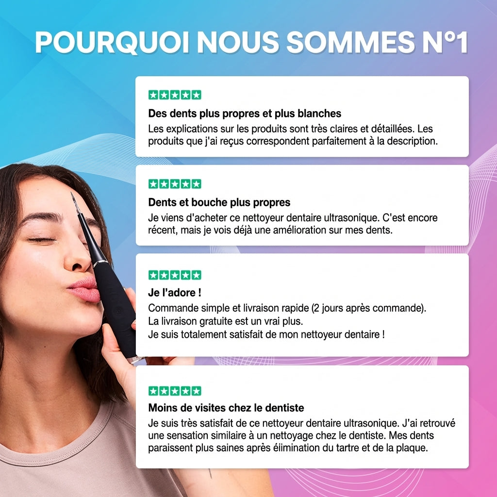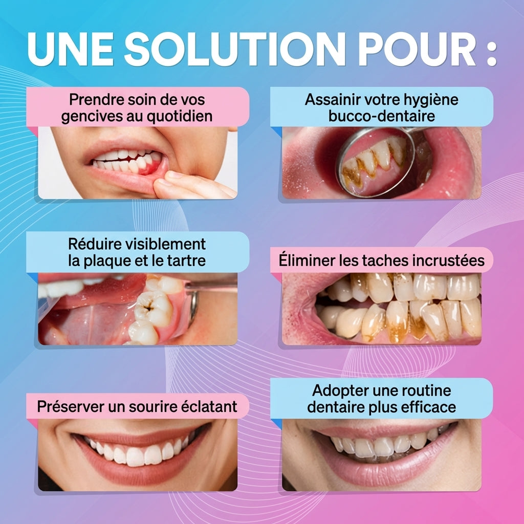 Ne laissez plus le tartre s'installer. Notre technologie cible précisément les zones oubliées par votre brosse à dents pour une hygiène irréprochable au quotidien.